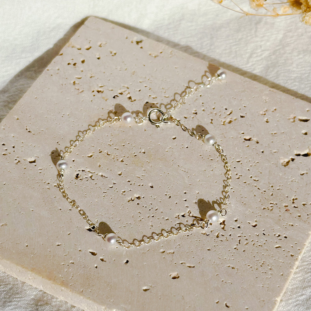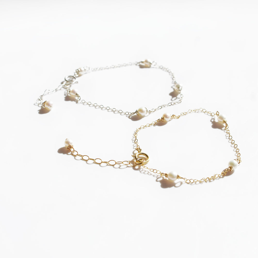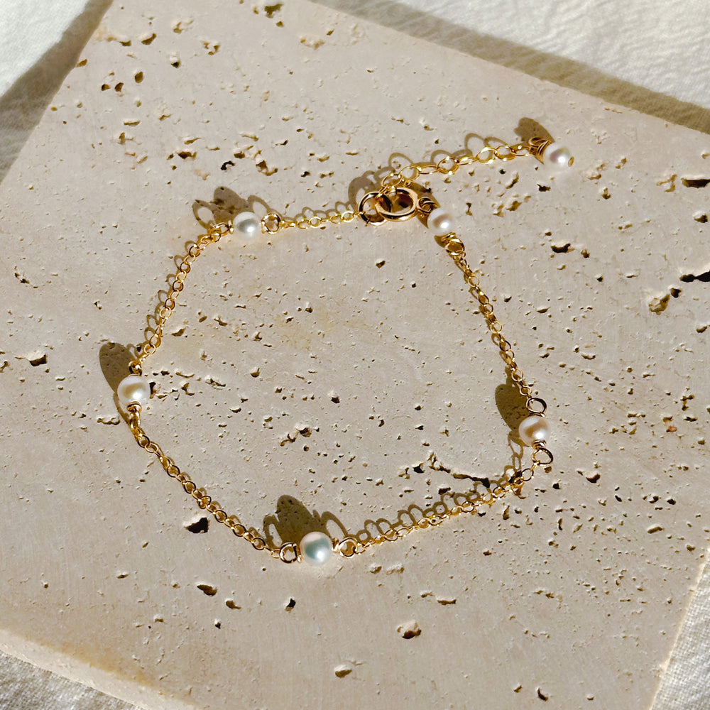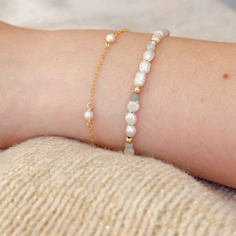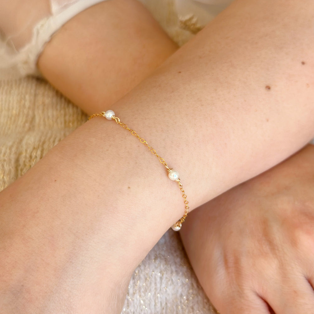 Upgrade your jewelry collection with the Hiromi Pearl Bracelet, available in both 14k gold filled and sterling silver finishes. Designed with high-quality natural freshwater pearls and a dainty chain, it combines classic sophistication with modern minimalism. Crafted for versatility, this dainty pearl bracelet features an adjustable chain closure to ensure a secure and comfortable fit for almost any wrist size. The lightweight design makes it perfect for everyday wear, weddings, or bridesmaid jewelry. Talk about being pearlfect!