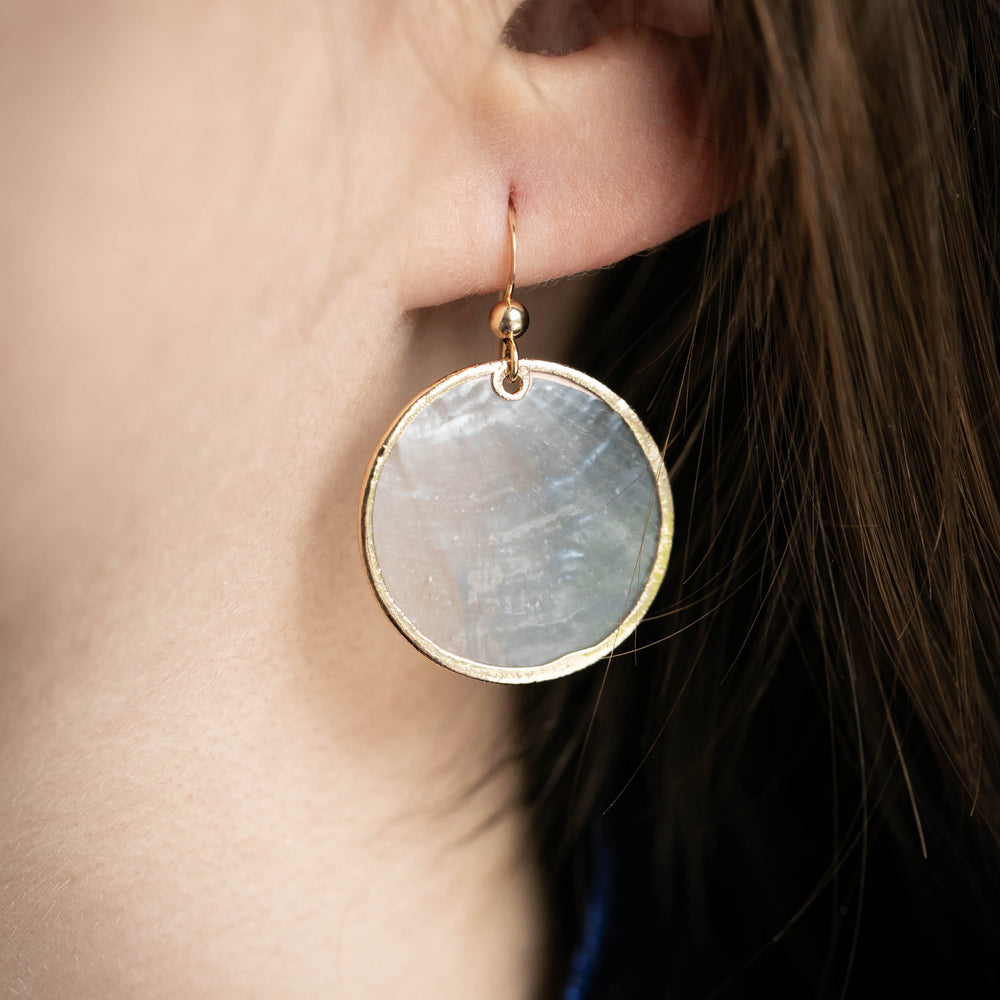The Hitomi Seashell Earrings draw inspiration from the Japanese name Hitomi, meaning "pupil of the eye." Designed with luminous mother of pearl seashell discs framed in delicate 14k gold filled, they shimmer softly with every movement, capturing light like a calm reflection on water. Perfect for ocean lovers and those drawn to meaningful jewelry, the Hitomi Seashell Earrings combine coastal charm with timeless sophistication.