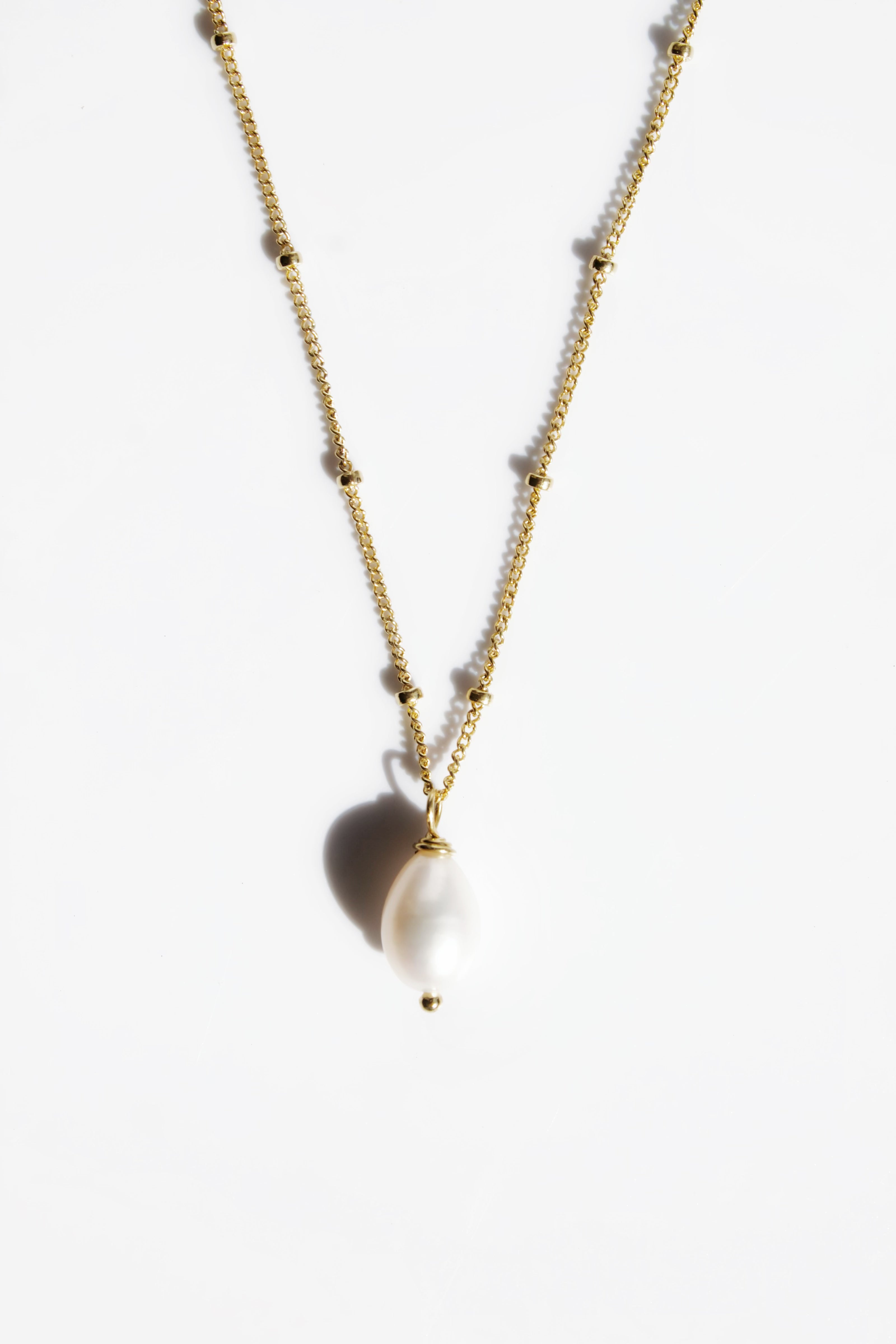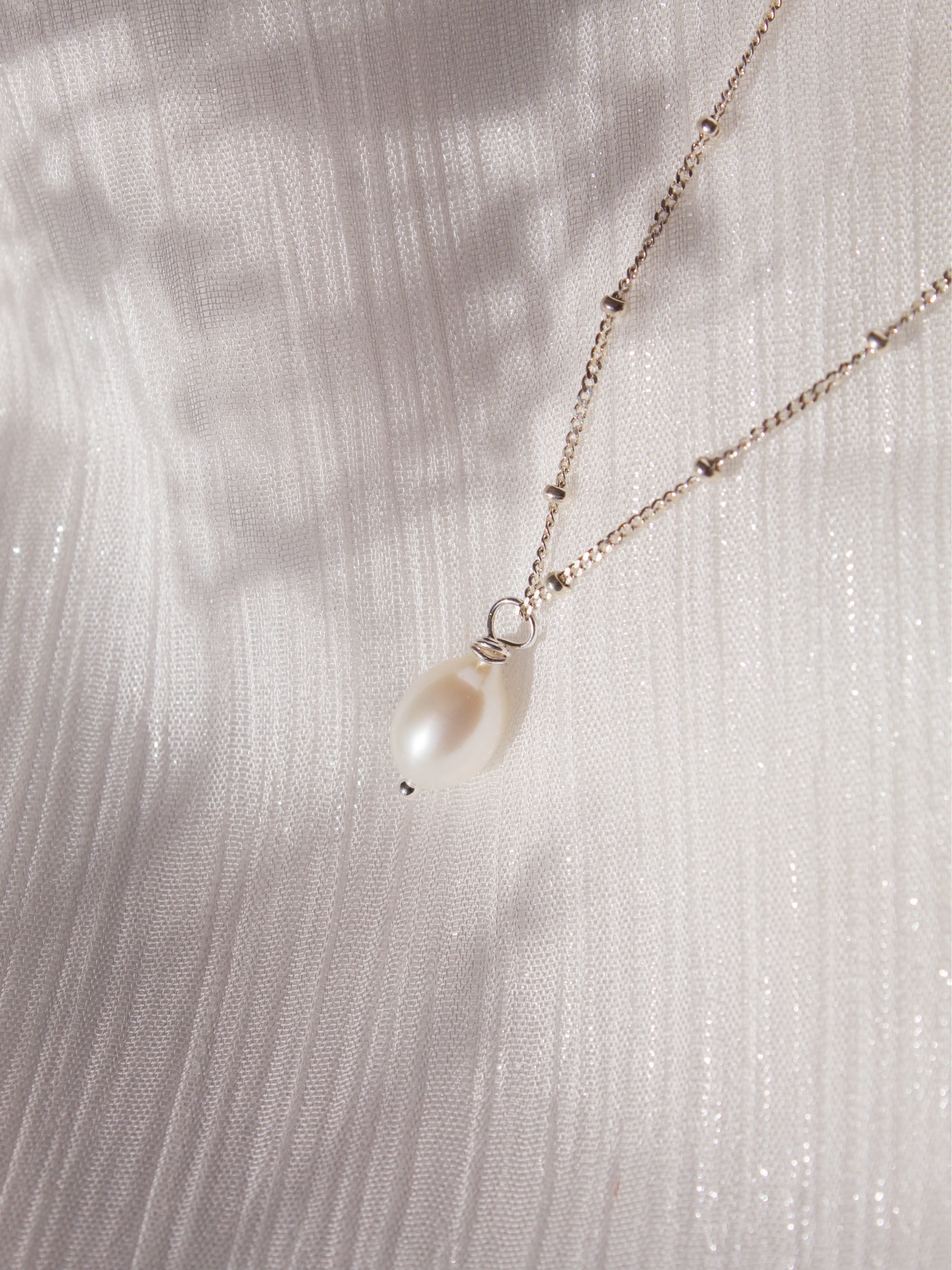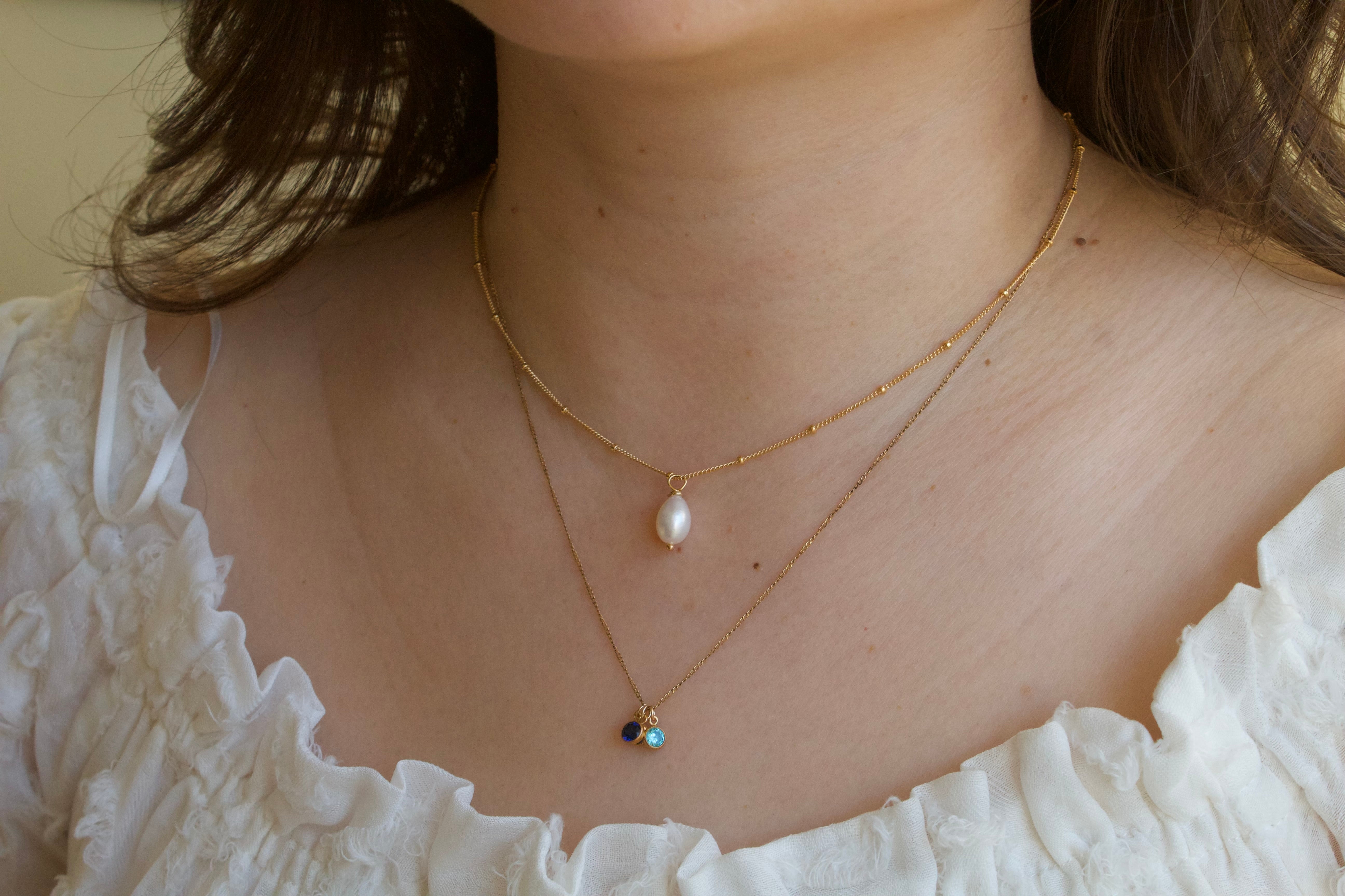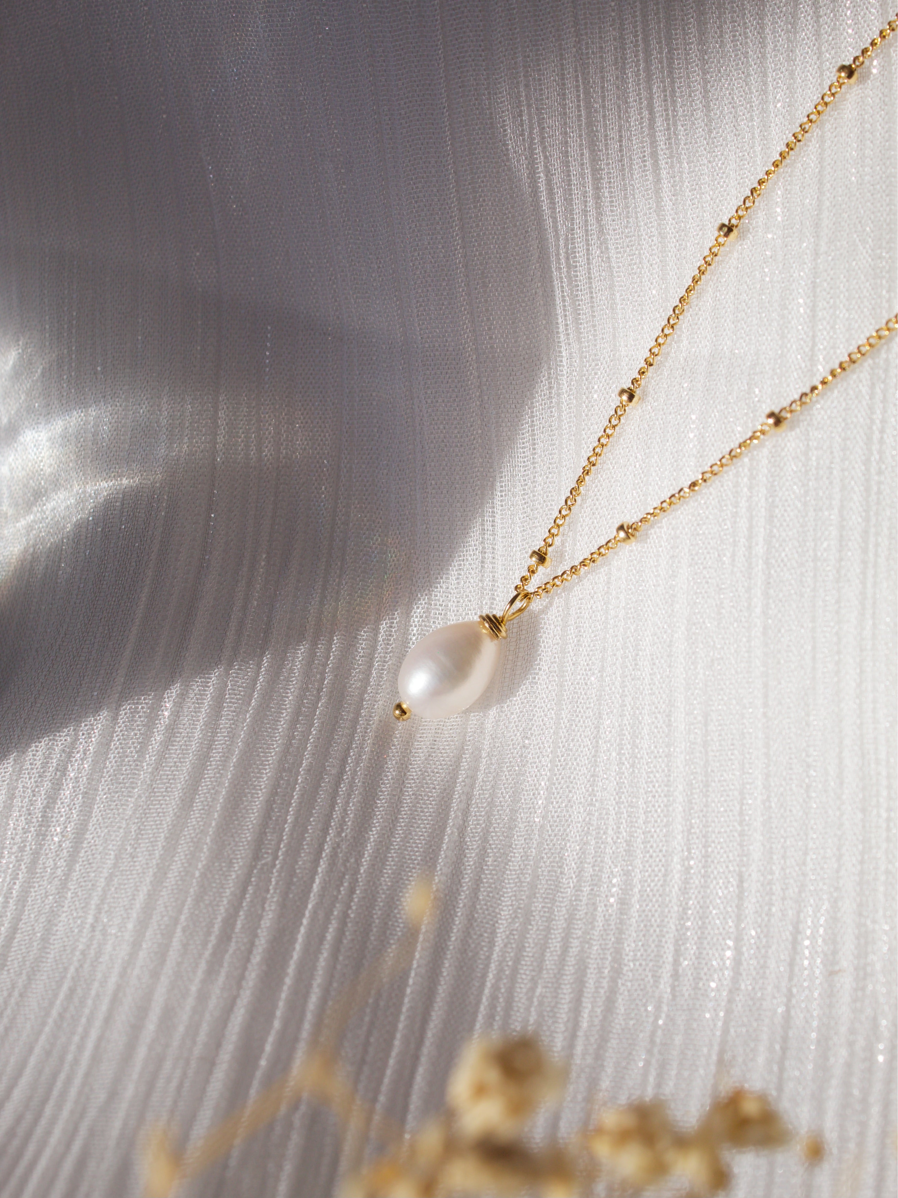 This elegant pearl necklace features 7mm-9mm teardrop-shaped freshwater pearls paired with a trendy satellite chain. Available in both 14k gold-filled and sterling silver, it measures 16” with a 2” extender, allowing you to adjust the length from 16” to 18”. A versatile and timeless piece that complements any style.