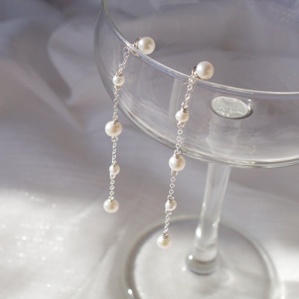 These elegant dangle earrings feature 3mm and 5mm freshwater pearls, creating a timeless and refined look. With their classic design, they are the perfect accessory for weddings, special occasions, or any moment when you want to add a touch of sophistication. The lustrous pearls dangle gracefully, making these earrings an effortlessly chic addition to your jewelry collection.