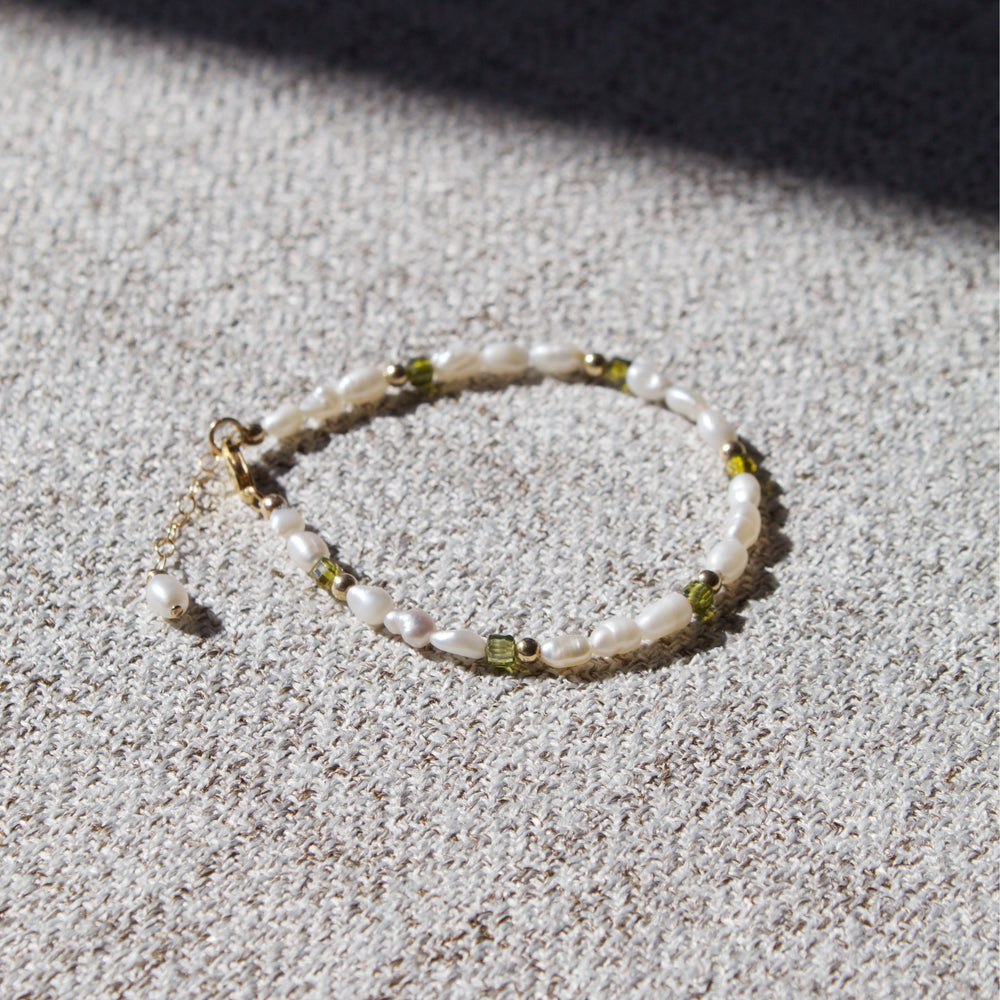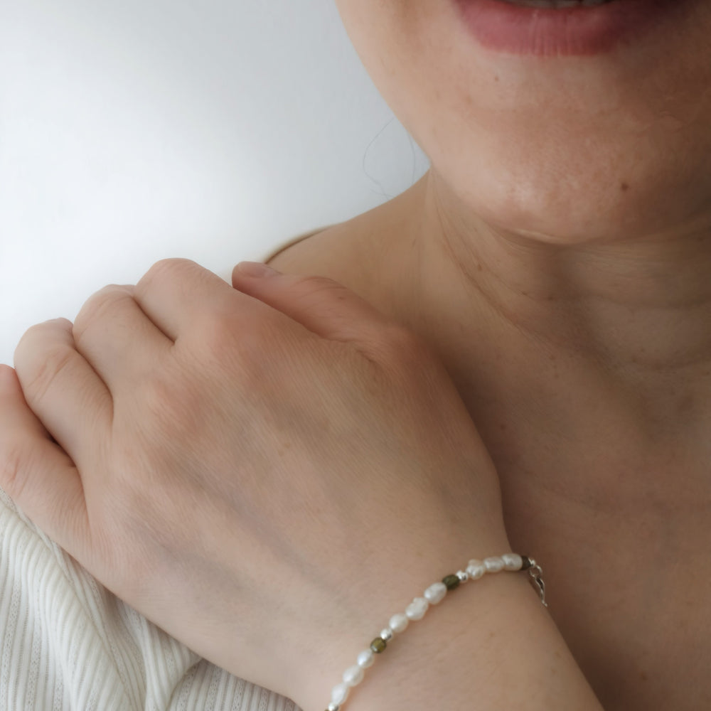 This beautiful bracelet combines lustrous pearls with natural green zircon stones, creating a unique and vibrant design. Add a touch of versatility to your style by wearing it alone or stack with other favorites for a unique look (brace yourself with compliments!) Available in both 14k gold-filled and sterling silver, this piece is adjustable, and if you need a custom size, feel free to reach out.